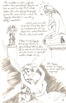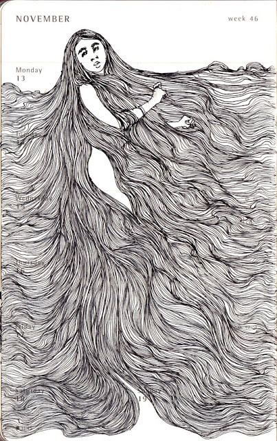 Over time I started drawing more and more hair. It's very calming to fill a page with curves and lines, and I enjoyed drawing the figures swimming in their own hair too.