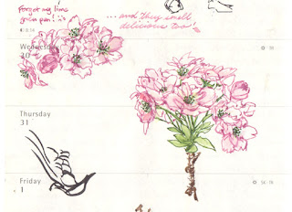 The backwards writing turns the words into just another design element, a textured background against the collage and drawings. Also, writing backwards makes me feel like everyone's ideal diarist and art hero, Leonardo da Vinci.