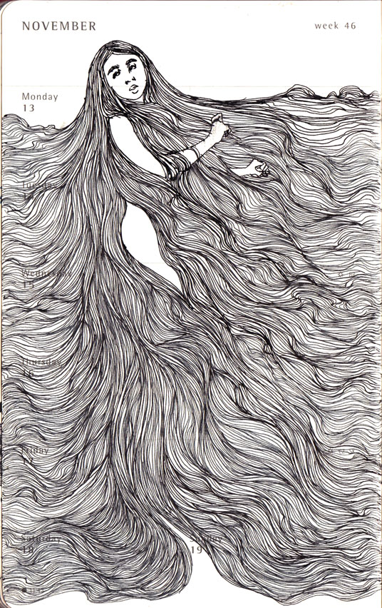 I love slowly filling up the spaces with ink, breathing out along with the long lines. I also like drawing the figures first, their expressions and poses, and working their hair around that. I can choose to show the shape of the body beneath, or not.
